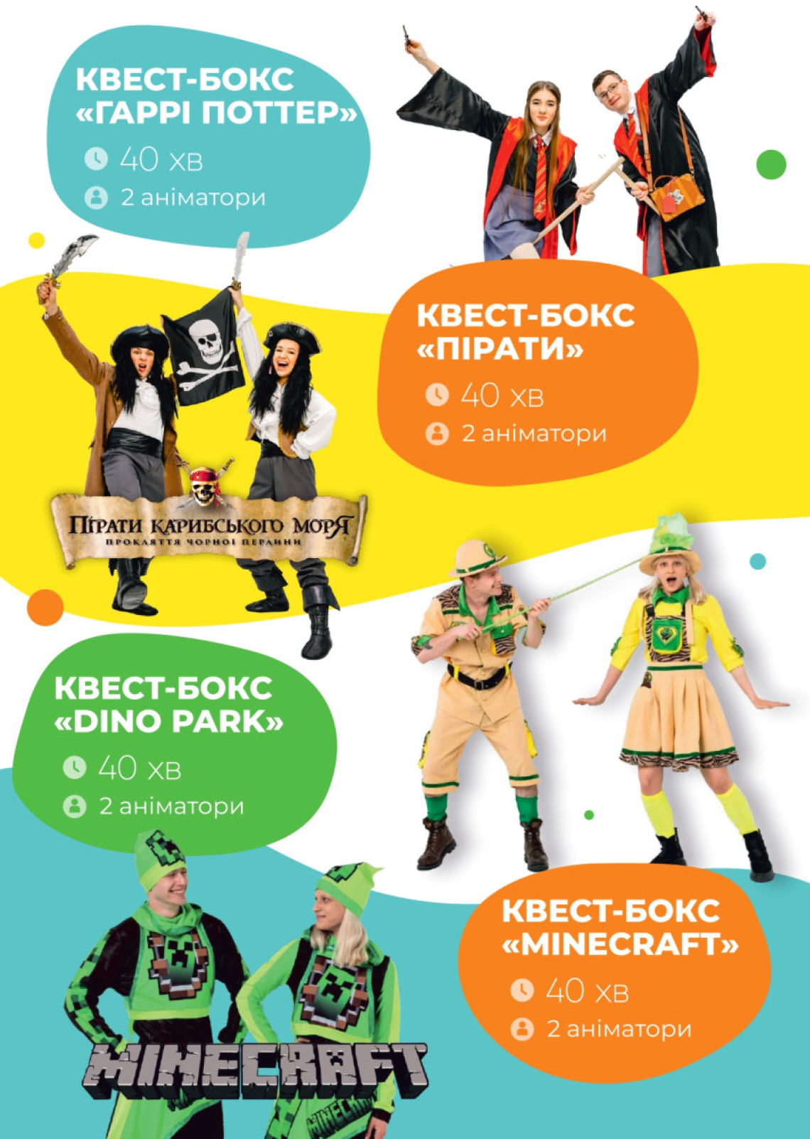Програму «Квест Box» проводять 2 аніматори в певній тематиці. На початку квесту дітям видають спеціальний реквізит (в залежності від обраної теми, який стане хорошим доповненням на святкових фото).